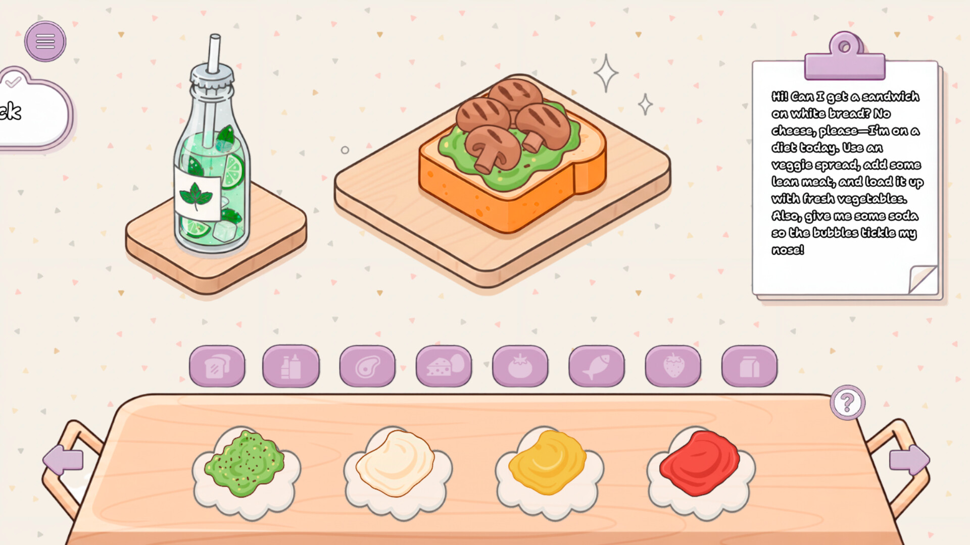Your task isn’t just to assemble a snack—it’s to truly listen and understand. Every customer arrives with a unique order card. What’s on the menu today? "I want something light, but no fish" or "Anything but cheese, I have an allergy"? Study the notes, decipher preferences, and mind the exclusions.