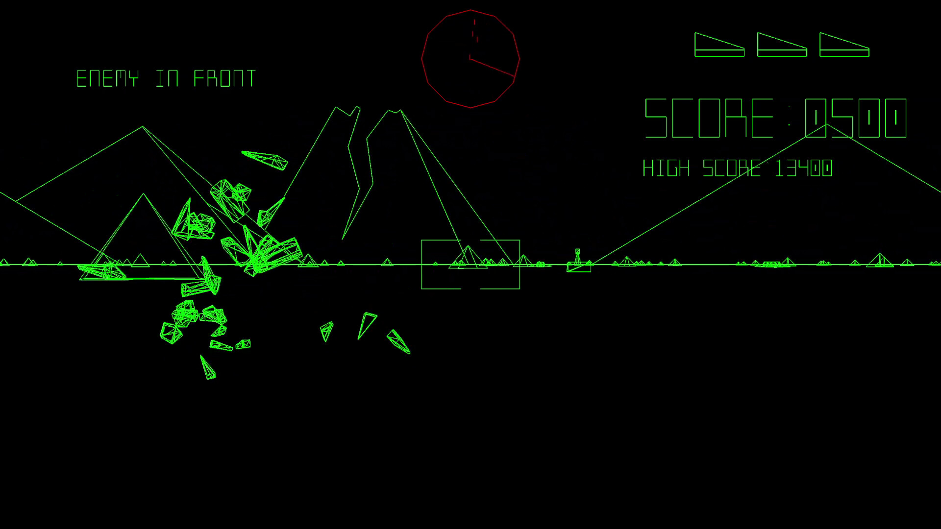 As the world falls inward, the environment itself becomes hostile. Heat distortions ripple across the screen. The ground fractures. Landmarks collapse into the horizon. The sun swells larger with each minute, bleaching out the vector lines until the battlefield becomes a blinding void.