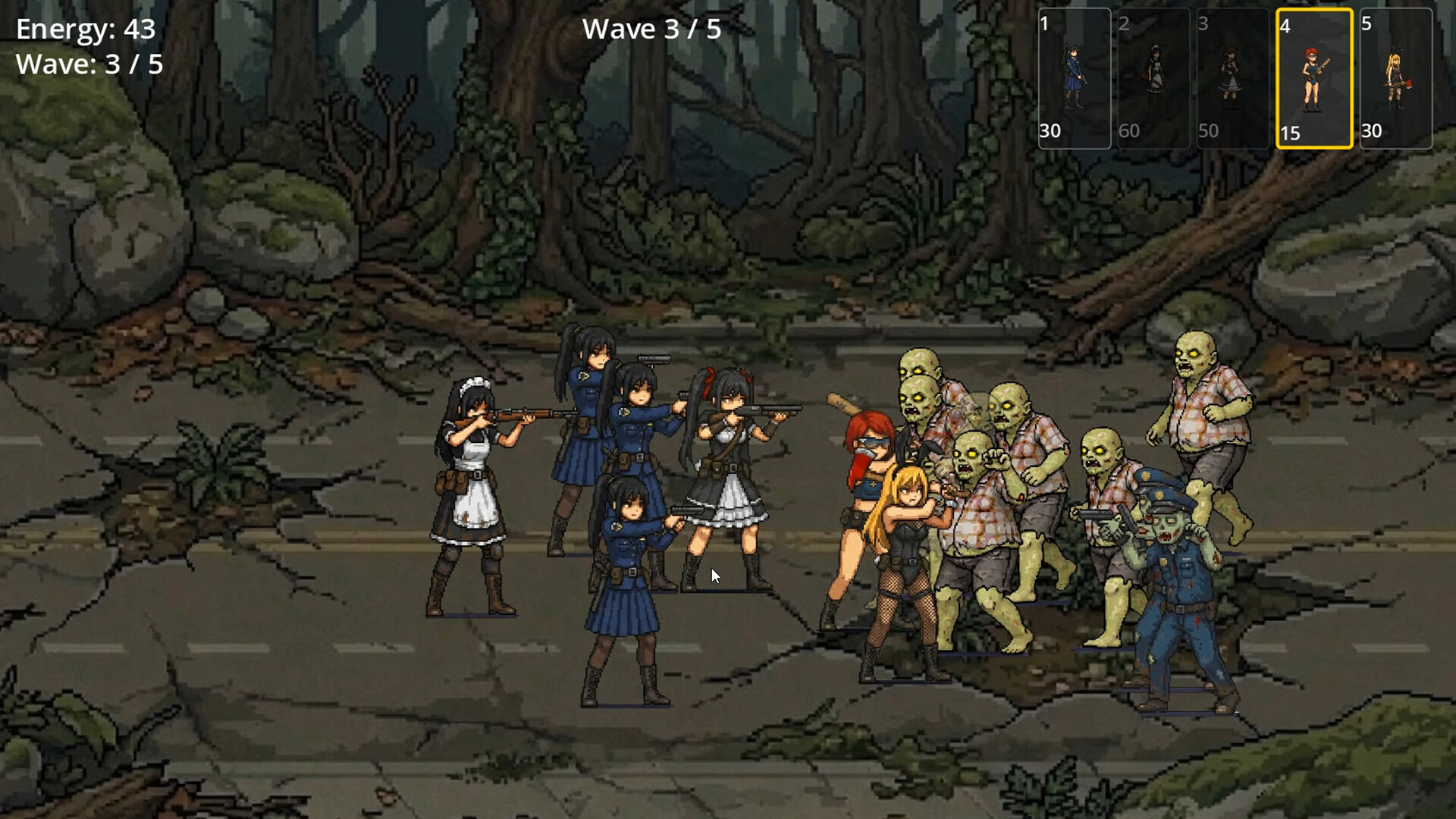 Command a squad of five girls to defend against zombie hordes across ruined cities, forests, deserts, and labs! Deploy melee and ranged units, manage energy, and find the best tactics to hold the line. Features 4 stages, Endless Mode, and unlockable CG illustrations. A pixel-art tower defense game!