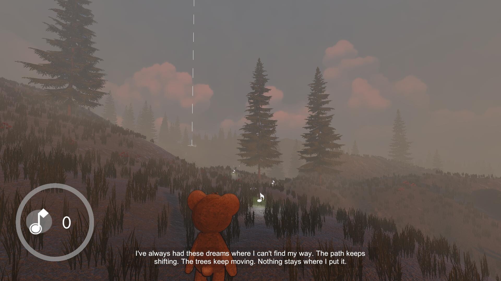 You move through a surreal landscape, collecting scattered music notes and pieces of a broken clarinet — instruments of calm, now fragmented. A shadow car trails behind you, never urgent, always present. The world is soft and strange, somewhere between sleep and memory. The narrator speaks as you move, working through questions they haven't answered yet: what it means to forgive yourself, to stay in control, to keep going anyway. The teddy bear keeps moving. So do you.