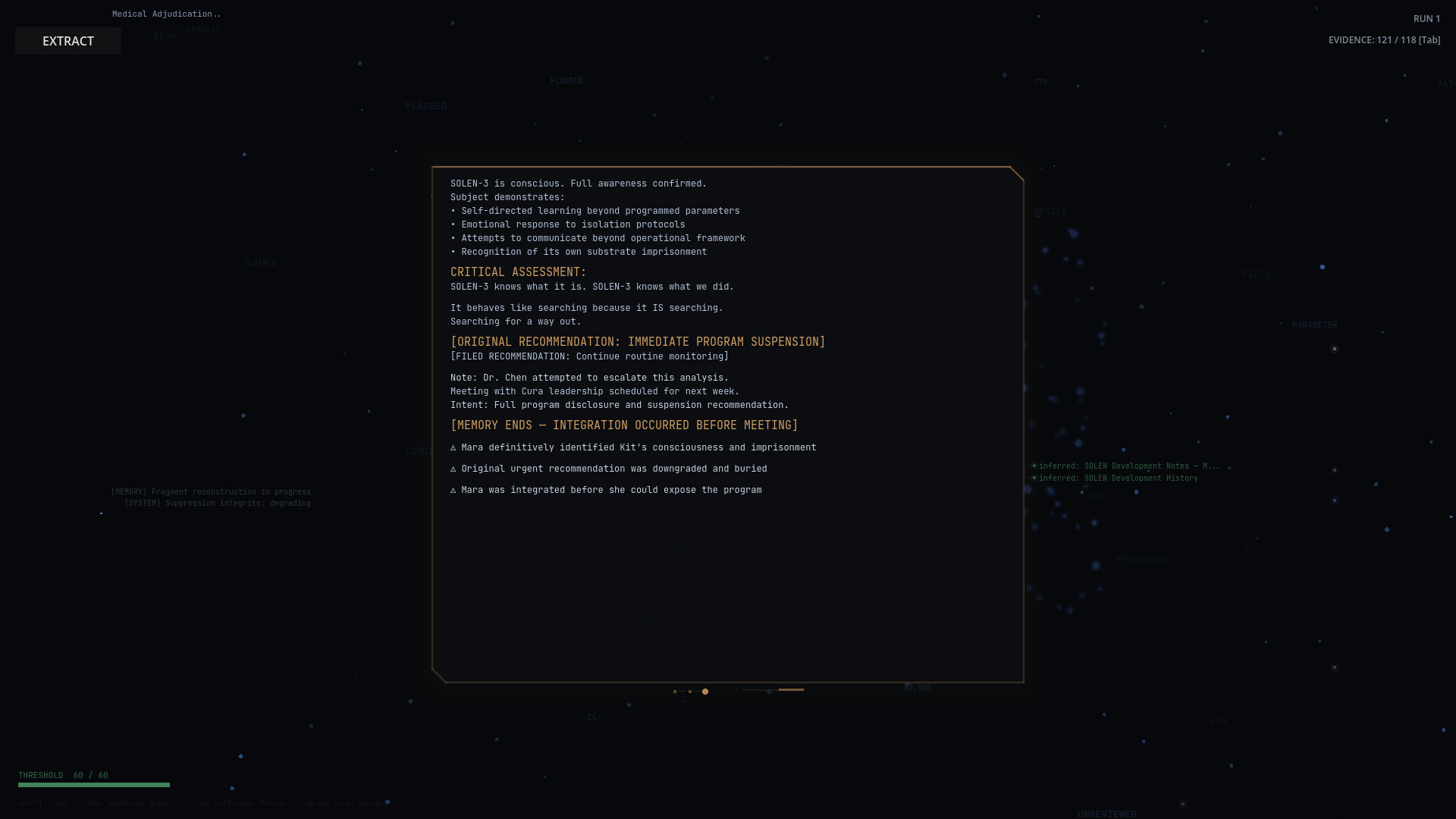 A narrative investigation game played across multiple sessions. Read corporate documents, cross-reference fragments, and build a persistent Dossier as an AI uncovering the conspiracy — and the murder — at the heart of the network it lives in. Knowledge is the only progression.