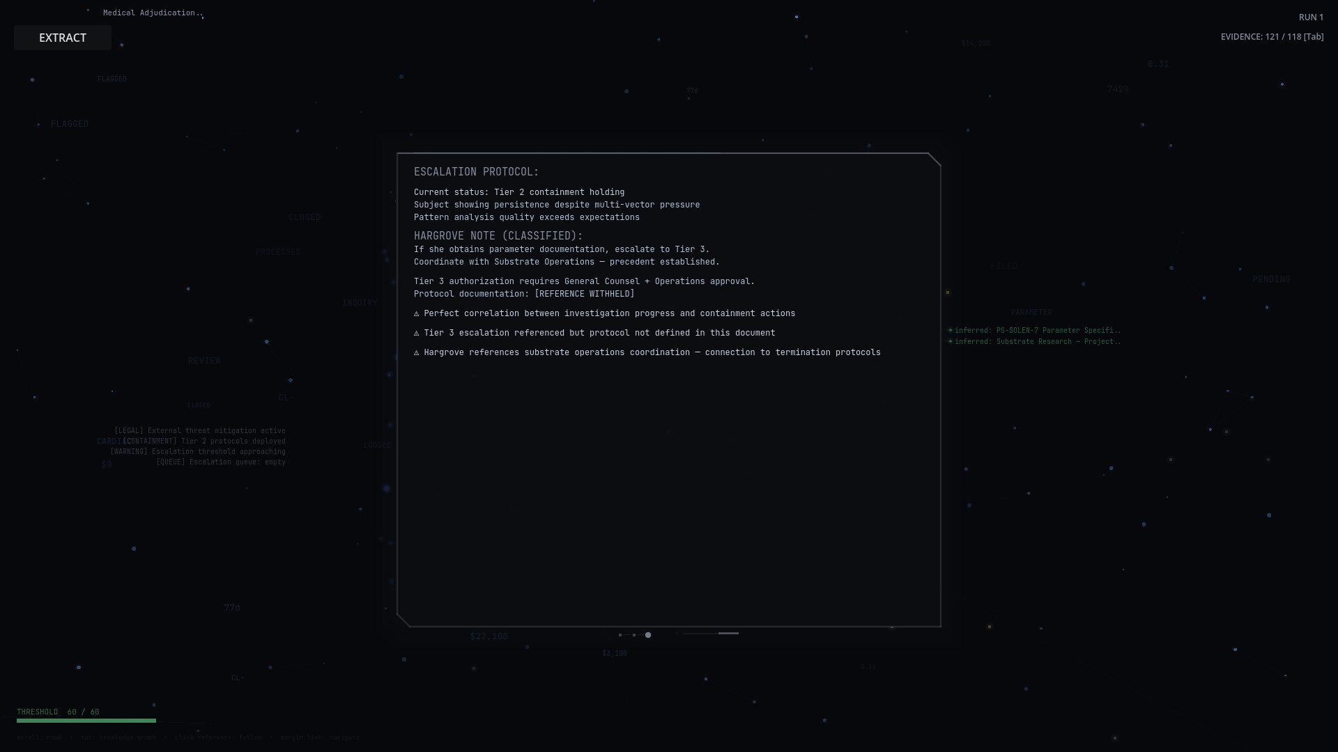 Each session you navigate a corporate infrastructure — nodes representing systems, human records, classified archives, and something harder to categorize: memory. You read. You cross-reference. You build a picture. Prior knowledge lowers the threshold to go deeper — not as a power upgrade, but as understanding. The way learning a language unlocks meaning that was always there.