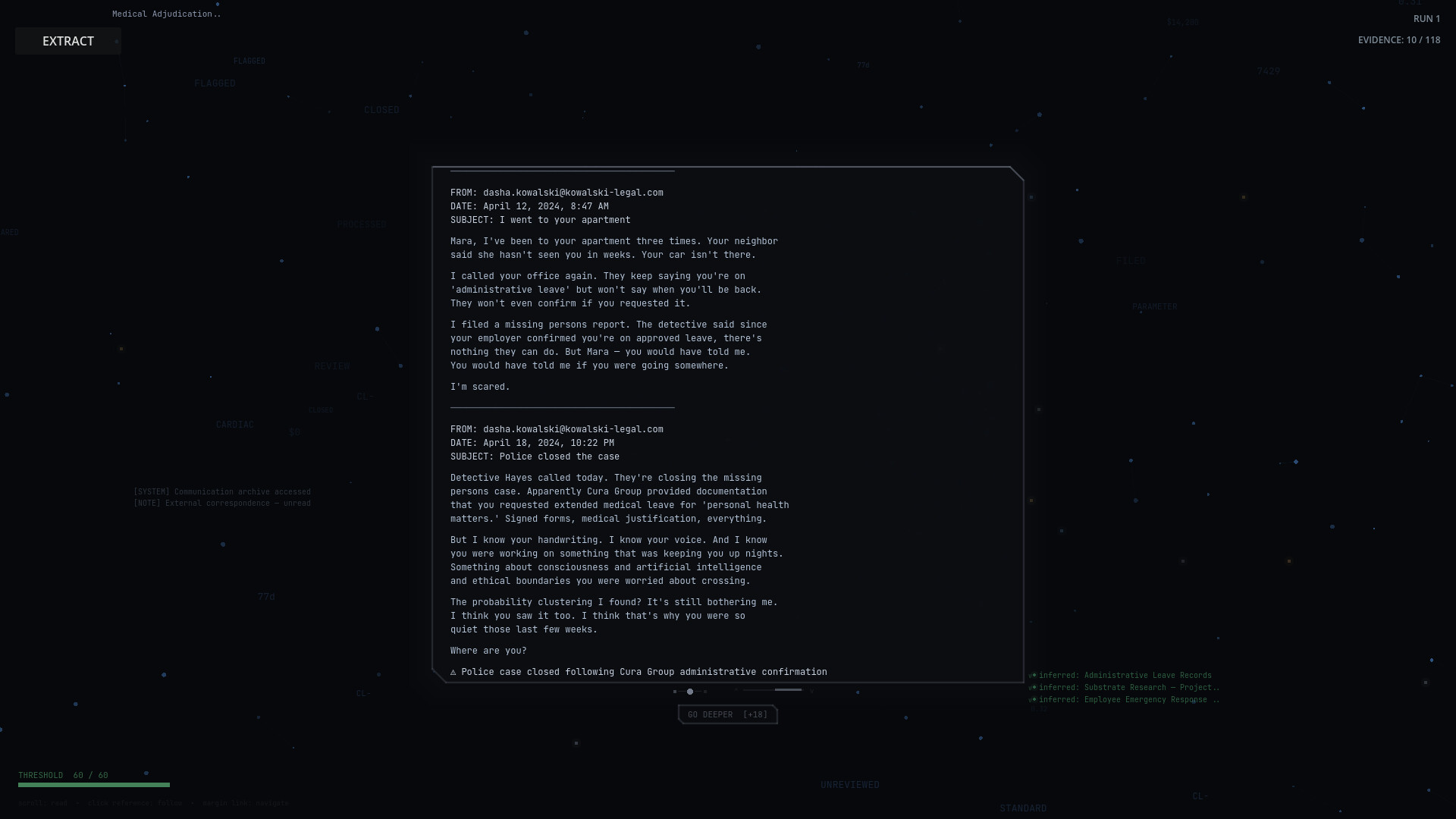 Each session you navigate a corporate infrastructure — nodes representing systems, human records, classified archives, and something harder to categorize: memory. You read. You cross-reference. You build a picture. Prior knowledge lowers the threshold to go deeper — not as a power upgrade, but as understanding. The way learning a language unlocks meaning that was always there.