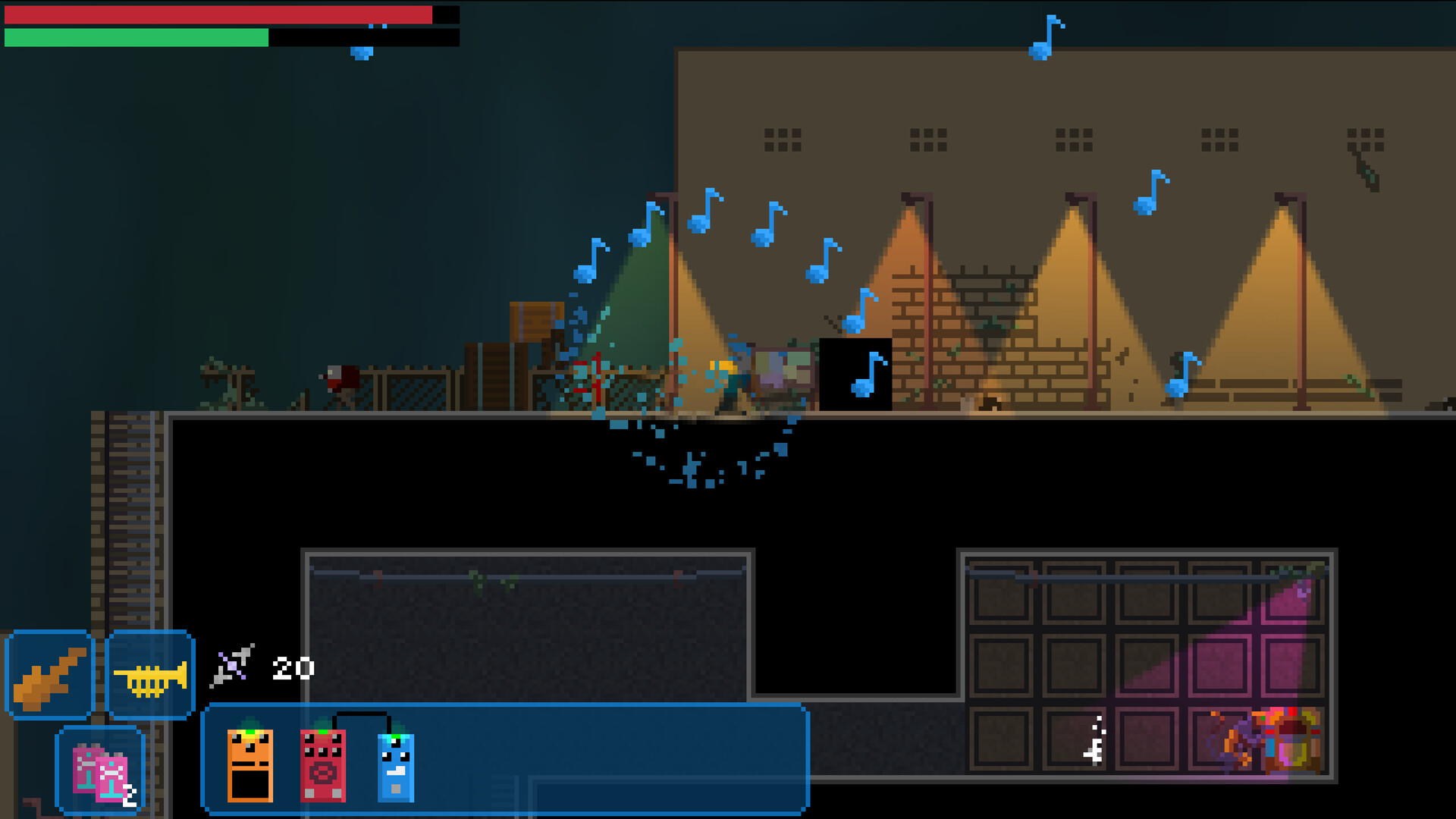 A noir metroidvania adventure in a mysterious Lost City spiced with souls-like gameplay systems. Multilayered 2D world design with intricate spatial depth. Equipable trumpets, guitar and guitar pedals.