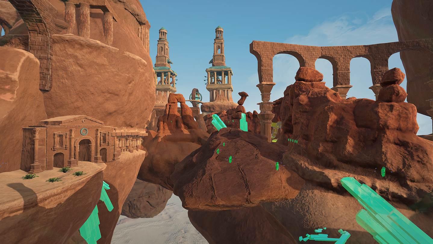 The environment for Skyreach was inspired by the Arches National Park of Utah mixed with the floating rocks on Pandora of James Cameron's Avatar. We also drew inspiration from the rock carvings of Petra, Jordan and Palmyra, Syria.