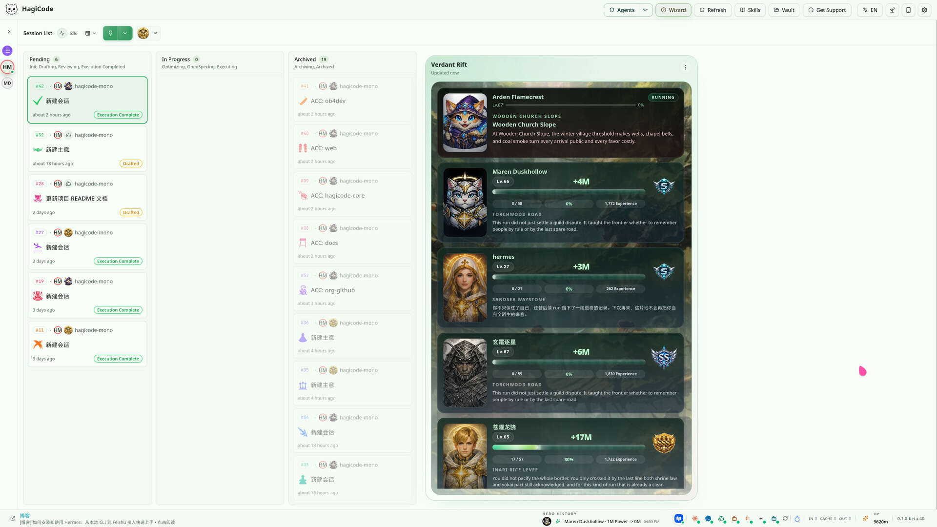 HagiCode includes a full presentation layer built around heroes, professions, load, and level progression. This is not just a cosmetic rename. It maps different agents, responsibilities, and work states into interface language that is easier to understand and manage.