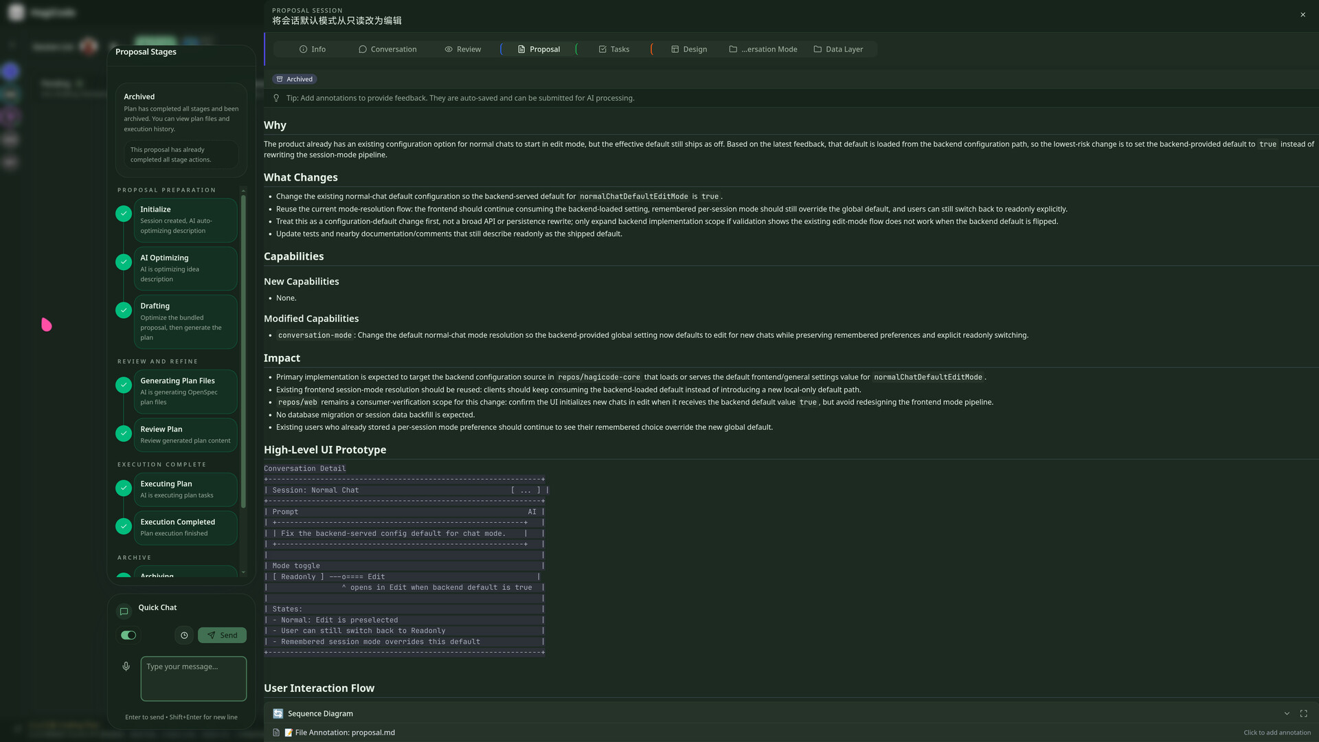 HagiCode has the OpenSpec workflow built in. For anything slightly more complex, the AI does not jump straight into editing files. It first turns the request into a proposal, tasks, impact scope, and validation steps.