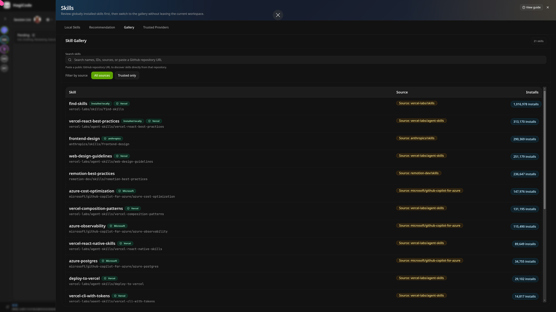 • inspect skill details, install commands, and trust status