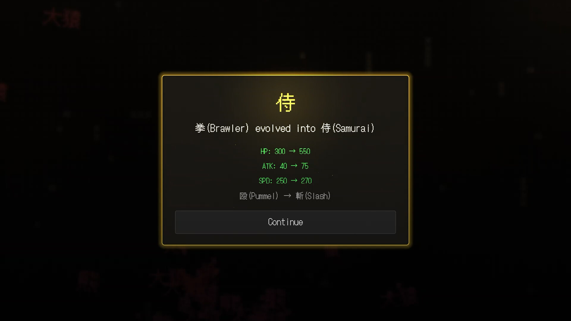 • Evolution system: 人 → 拳 → 侍 → 鬼 → 神