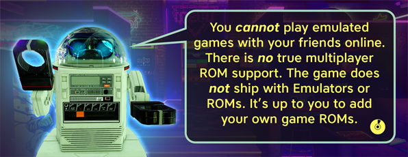 NOTE: You must add your own game ROMs. Setting up New Retro Arcade: Neon may seem like a daunting task. It is indeed a labour of love. If you have no knowledge concerning emulation, or you’re expecting a fully working arcade with pre-installed game ROMs, then this game may not be for you.