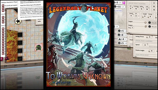 To Worlds Unknown is an adventure for 2nd to 5th-level characters which can be played as a standalone adventure or as the first main chapter in the Legendary Planet Adventure Path, bringing your heroes into the midst of a battle beyond the stars for supremacy over myriad alien worlds and alien cultures. Against the backdrop of great powers both ancient and new, small-time power players and petty criminals vie in the grungy back alleys of a crossroads world, and the heroes must discover who can help them find their way to safety through an impossible network of planetary portals before their erstwhile allies betray them to those whose secret schemes are far more sinister.