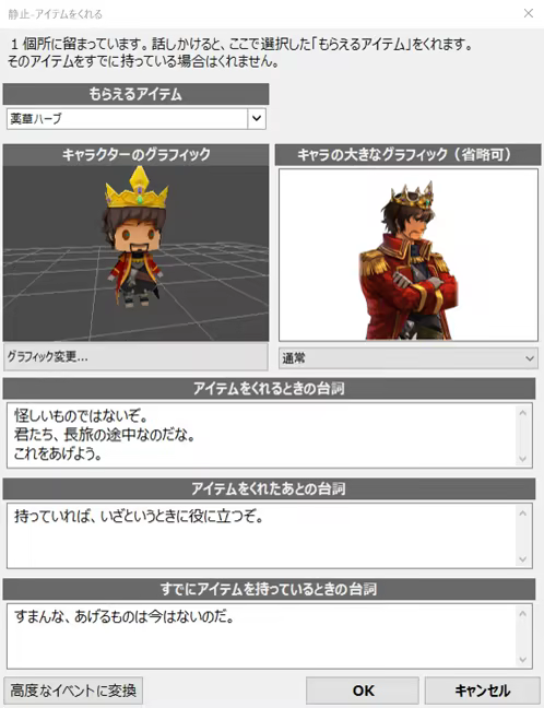 138種類以上のイベントテンプレートを使って、RPGでよくある”話かけるとアイテムをくれる村人”や”会話シーンのあとにバトルが開始!”というようなRPGでよくあるシーンをあっという間に作り上げることができます。テンプレートからカスタマイズすることも可能です。