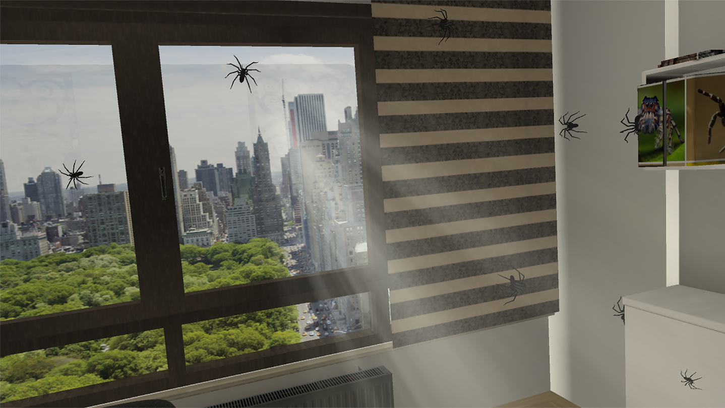 Arachnophobia is a VR application within the field of health and psychology, a - not too serious - self-controlled implementation of a virtual reality exposure therapy session, where you gradually expose yourself to spiders.