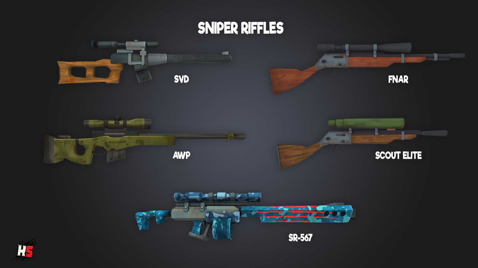-Various types of weapons including Assaults, Equipments, Machine Guns, Pistols, Rocket Launchers, Shotguns and Snipers;
