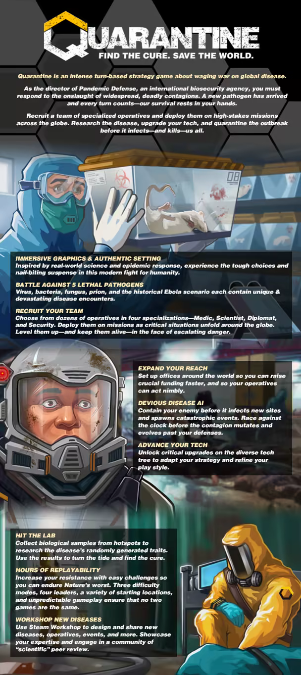 Quarantine is an intense turn-based strategy game about waging war on pandemic disease. Recruit a team of specialized operatives to deploy on worldwide missions. Research the contagion, upgrade your tech, and quarantine the outbreak before it kills us all.