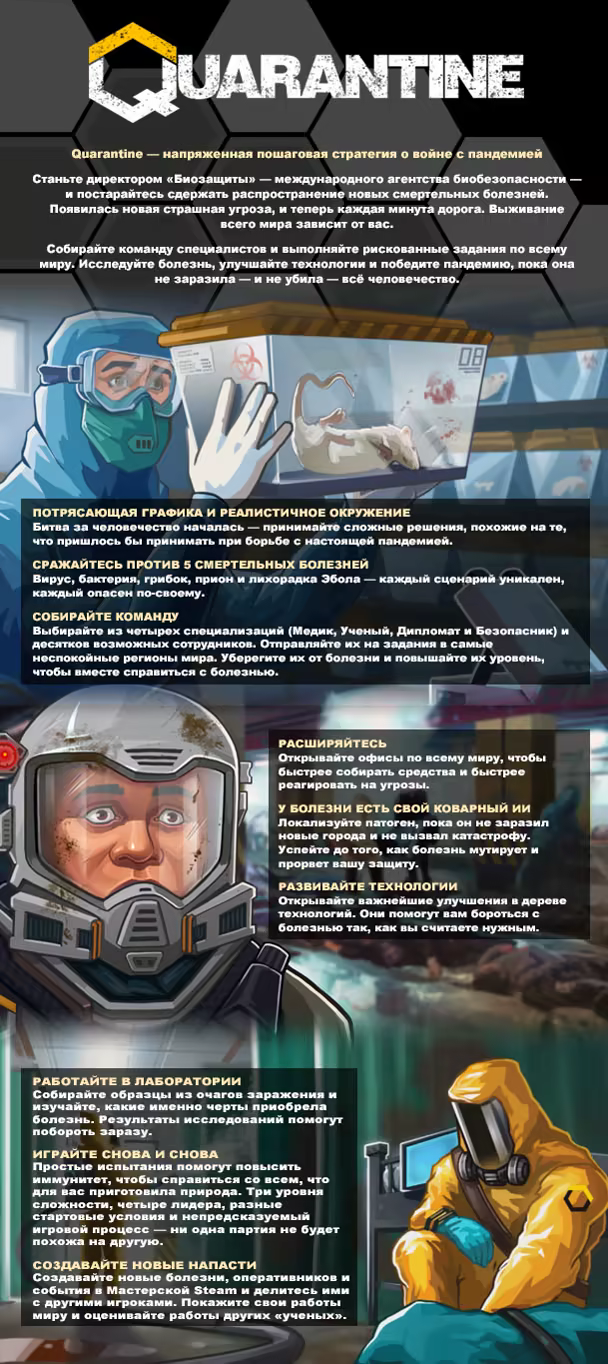 Игра вышла из «Раннего доступа»! Quarantine — напряженная пошаговая стратегия о войне с пандемией. Собирайте команду специалистов и выполняйте задания по всему миру. Исследуйте болезнь, улучшайте технологии и победите пандемию, пока она не убила всех нас.