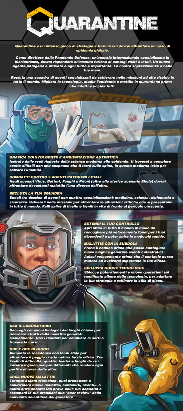 Non è più in Accesso anticipato! Quarantine è un intenso gioco di strategia a turni in cui dovrai affrontare una pandemia. Recluta una squadra di agenti specializzati da schierare nelle missioni in tutto il mondo. Studia il contagio, migliora la tecnologia e metti in quarantena l'epidemia prima che... ci uccida tutti.