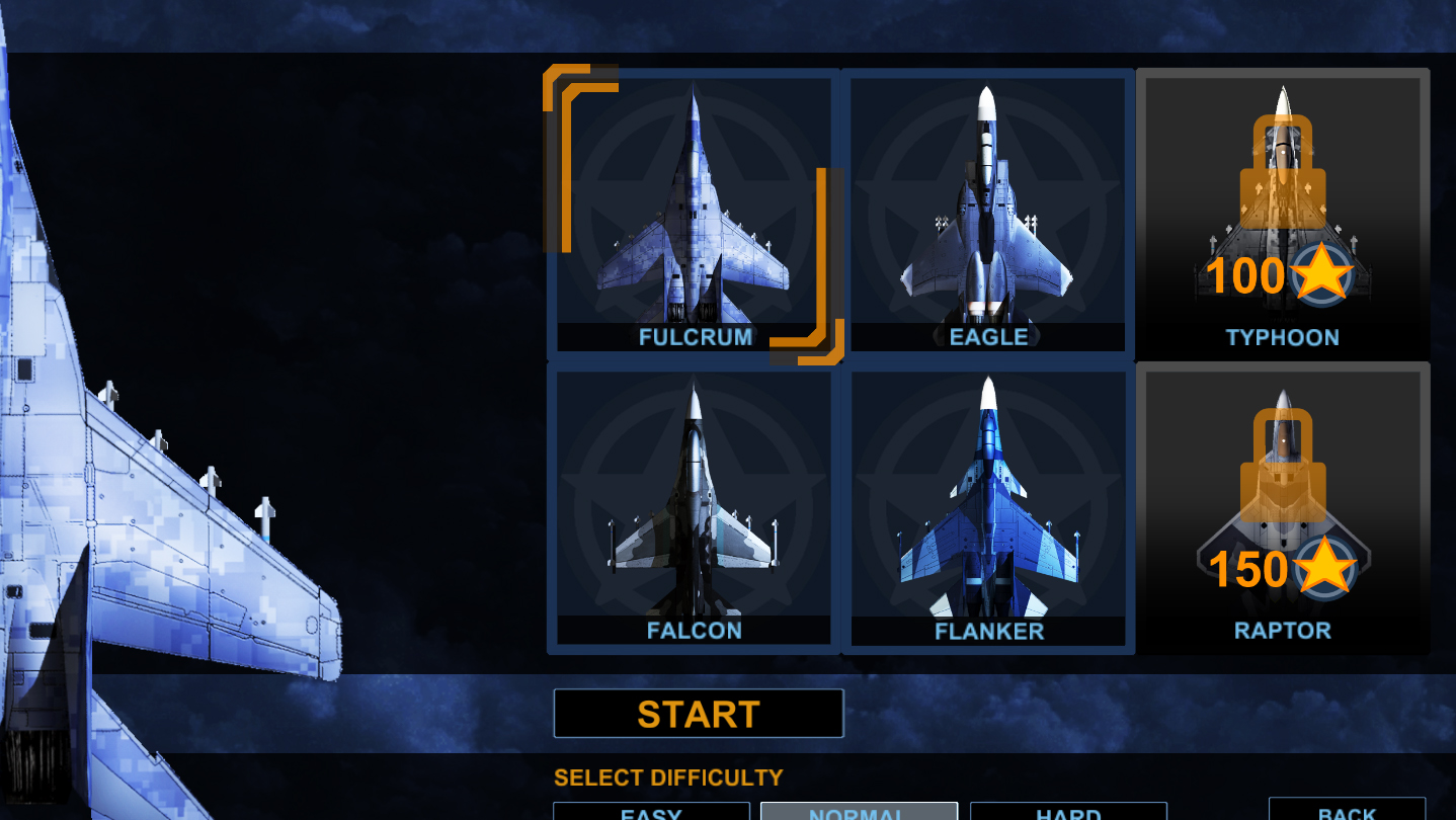 • simple but fun to use money system – earn money with every mission, upgrade your fighter aircraft and buy weapons or support drones