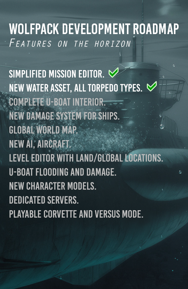 In order to make Wolfpack reach its full potential, we believe that the involvement of the community is essential during the entire process. Not only by providing technical and historical facts, but also by actually playing the game, contributing with ideas regarding campaign scenarios and missions, enemy behaviour and additional features such as difficulty options. It is a lot more efficient for us as developers to take part of your actual experiences as players, rather than keeping you guessing how the game actually feels to play.