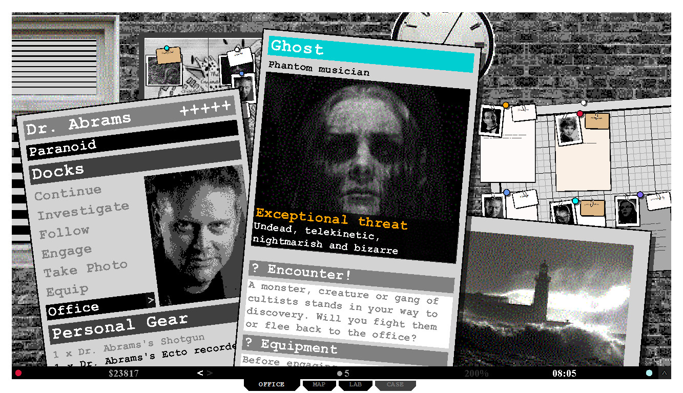 このゲームは、H.P. ラヴクラフトの作品に大きく影響を受け、1940年代の不確実さとノワールの雰囲気をベースにしています。経験豊富なジャーナリスト、探偵、オカルト専門家の6人組を、町での殺人、不倫、恐怖事件の調査に派遣してください。