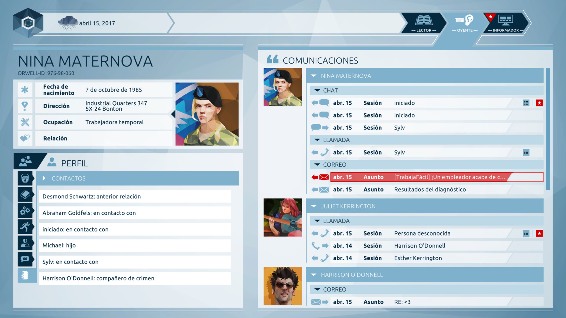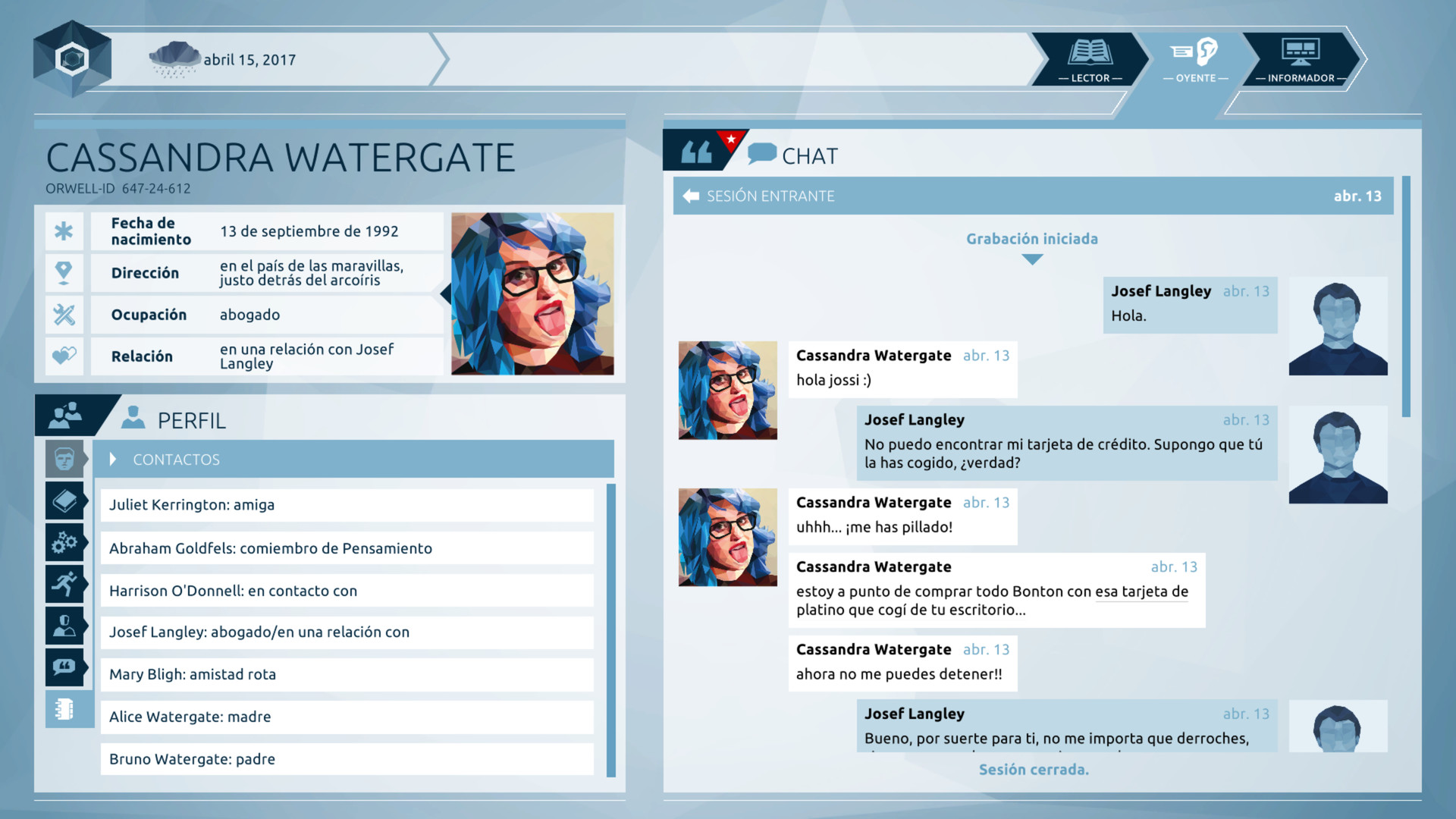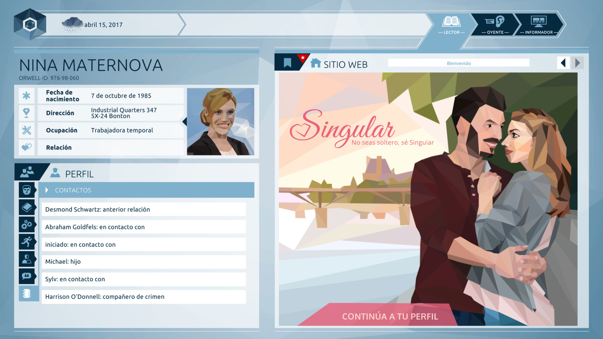 Eres el primer investigador humano de Orwell, seleccionado entre miles de candidatos. Y después de que un ataque terrorista sacudiera la capital de la Nación, Bonton, te han puesto inmediatamente a prueba. Comenzarás con una sola persona de interés, y con eso ayudarás a las fuerzas de seguridad a construir una red de perfiles de posibles culpables.