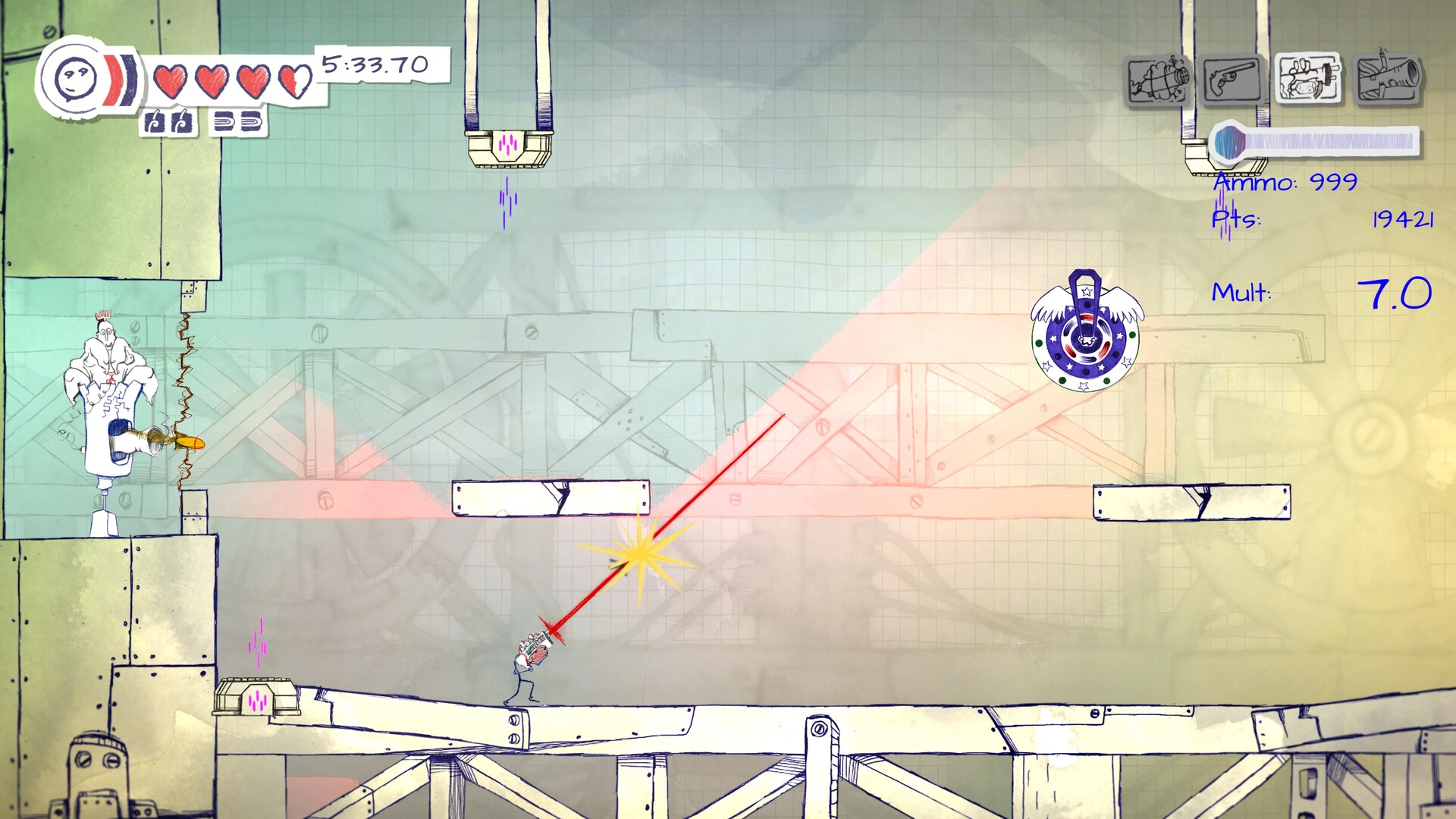 Combat and exploration are the heart of Pengame. Stickman is a natural jumper, with some less-than-natural time manipulation abilities. He also has access to various weapons, with unique strengths and weaknesses. Mastering his arsenal and making use of his time manipulation talents are crucial to prevail against overwhelming odds and traverse through the most treacherous areas of the notebook.