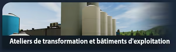 Une vraie ferme, ce ne sont pas seulement des champs cultivés. Tu dispose de plus d'une quarantaine de bâtiments en commençant par les bâtiments d'élevage et les granges et en finissant par les ateliers et les usines de transformation. Tu es touché par le fléau de l'abondance de récolte? Il est peut-être temps d'investir dans un atelier de transformation? Construis une usine spécialisée pour transformer les produits que tu as obtenu. Fabrique des jus et des surgelés. Tu as produit trop de lait de vache, de chèvre ou de brebis? Lance-toi dans la production de fromages ou de beurre, à moins que tu ne préfères produire de la viande.