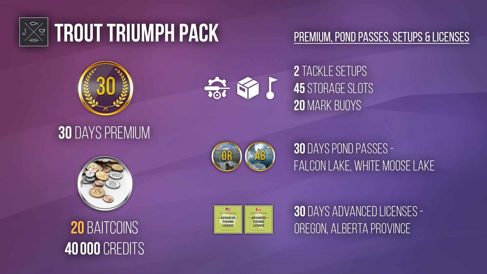 Show your wild side, wander high into the mountains, explore hidden trails amidst Canadian wilderness, discover rocky lakes with crystal clear water and prepare to face the challenge of the luscious supple Trout. And boy, are you prepared! The Trout Triumph Pack will give you the taste of a real Trout hunt!
