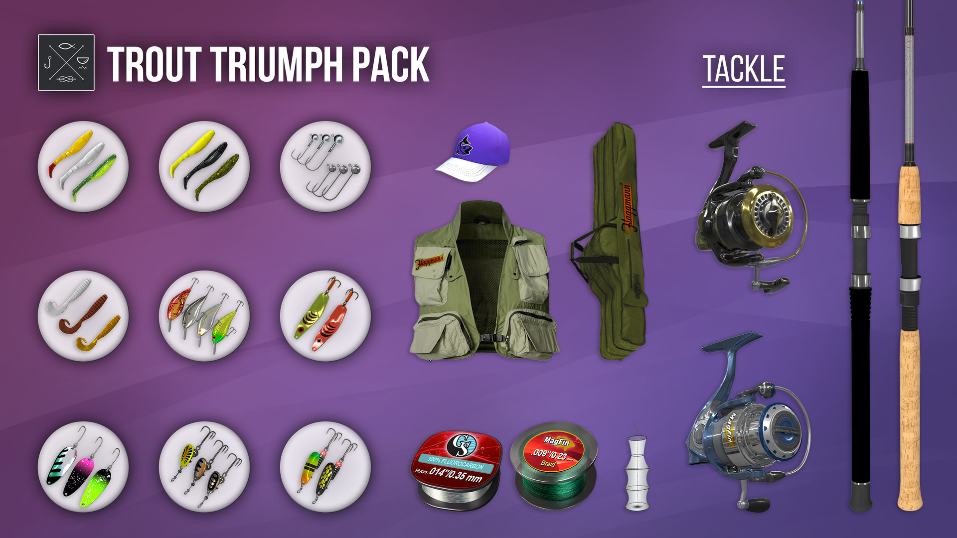 Are you up for some monster Trout fights? Yep, right now! With this Trout Triumph Pack not only do you get a full set of the most advanced Trout tackle, but also a hot tour to the most Trout savvy fishing destinations in North America! No need to wait and gain XP levels - get your hands on advanced spinning gear TODAY, and go after the biggest predators!