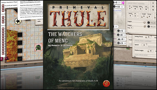The Watchers of Meng is a short adventure for 5th to 8th level characters, set in the Primeval Thule campaign setting, and written by prolific designer Robert J Schwalb, the creator of Shadow of the Demon Lord RPG and countless other roleplaying titles. This adventure was written as part of the Primeval Thule 5e kickstarter campaign, and is now available for purchase for your 5e Thule game!