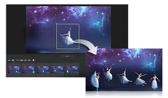 Create breathtaking, wide-angle panoramas by stitching together a sequence of images from your videos. Select the stills you want to use from your video, then PhotoDirector will stitch them together for a flawless panoramic image.