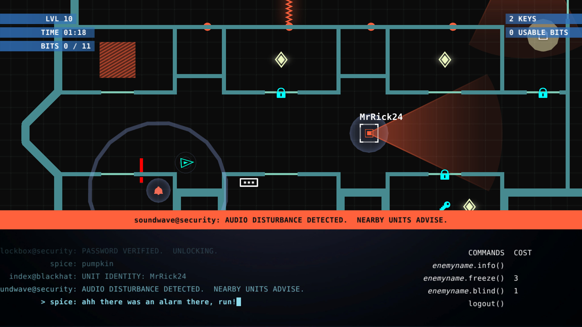 Each level is crawling with robot agents including the grunt, captain, king, or the hunter, who can sniff out your trail and chase you down. Environment challenges like laser traps and sound-detecting alarms keep you on your toes.
