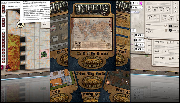 Requires: The free Fantasy Grounds virtual tabletop (VTT) software and any Ruleset (Savage Worlds v4 and Rippers Resurrected suggested).