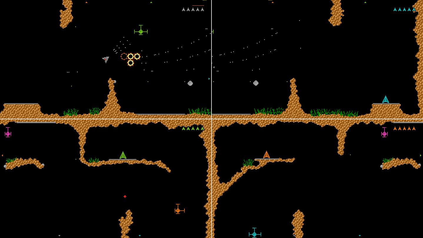 Super Grav is a retro gravity cave flyer for 1-4 players, featuring single player or co-op multiplayer missions, racing and dogfighting.