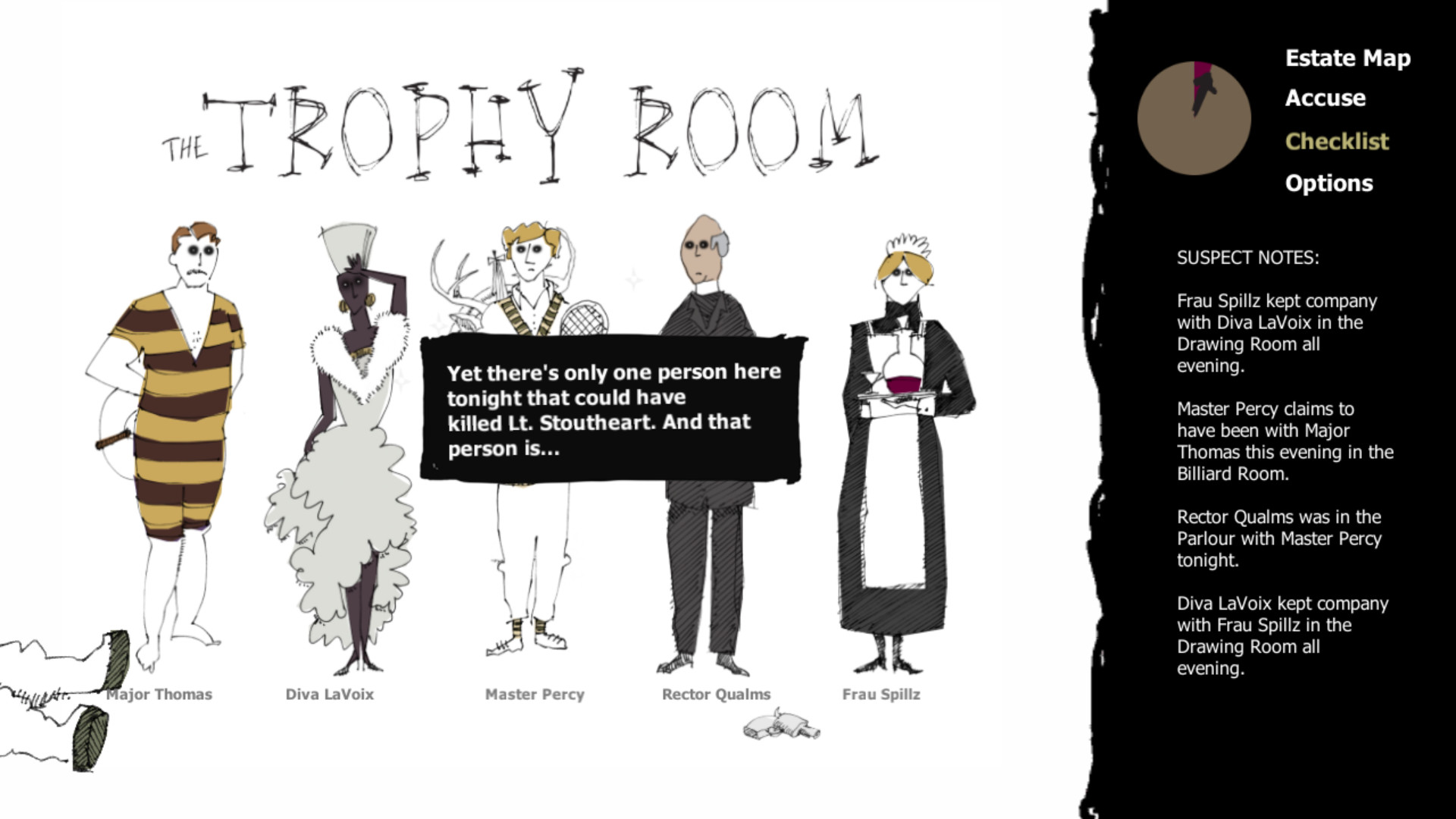 Zounds! One of the guests at an English house party has fallen victim to cold-blooded murder. Your weekend in the country is ruined! What choice have you but to ask your fellow guests probing questions, search the house, draw astonishingly insightful conclusions and solve the crime?