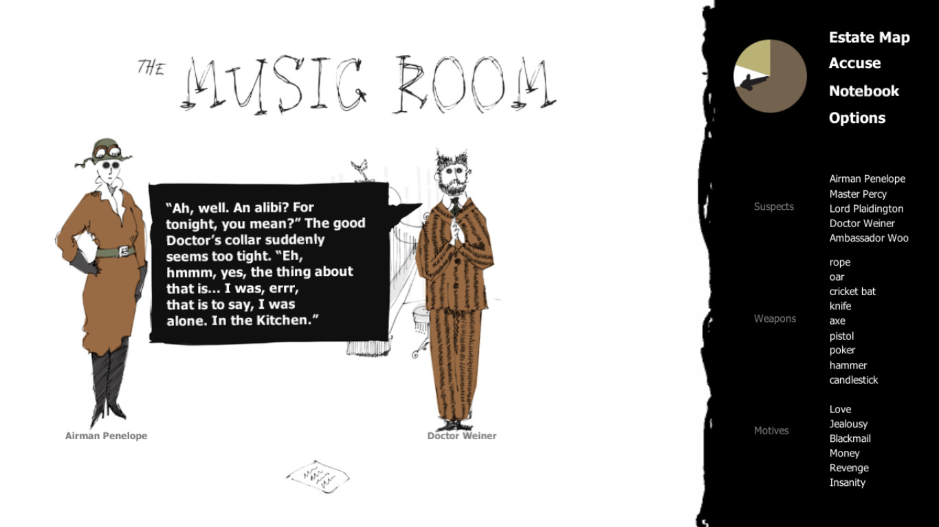 A Matter of Murder is a point-and-click puzzle game with rogue-like elements. The details of each murder are procedurally generated, so each case is different every time you play with progressively more challenging logic puzzles.