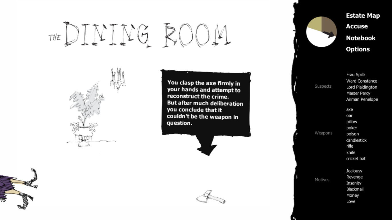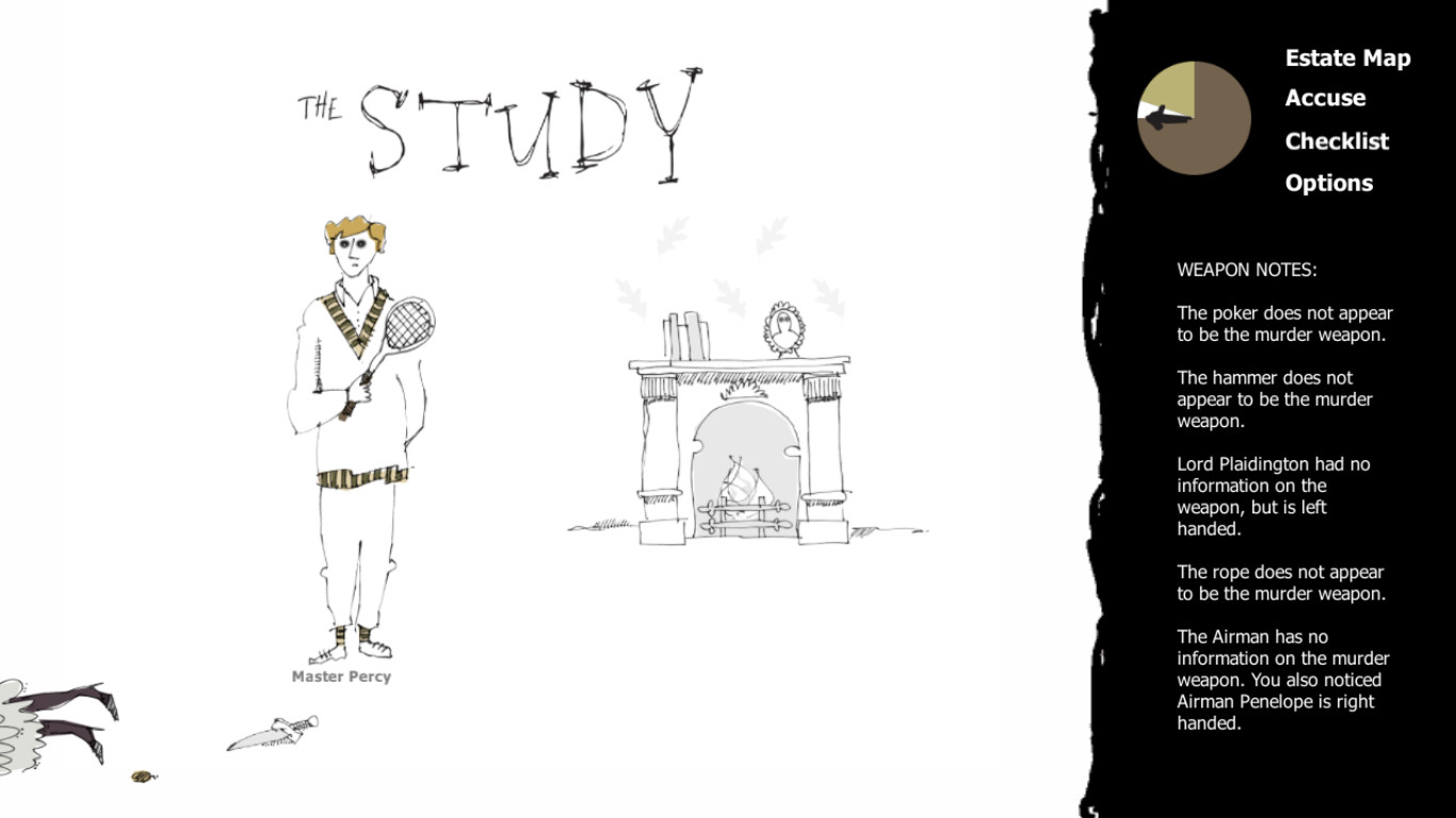 Zounds! One of the guests at an English house party has fallen victim to cold-blooded murder. Your weekend in the country is ruined! What choice have you but to ask your fellow guests probing questions, search the house, draw astonishingly insightful conclusions and solve the crime?