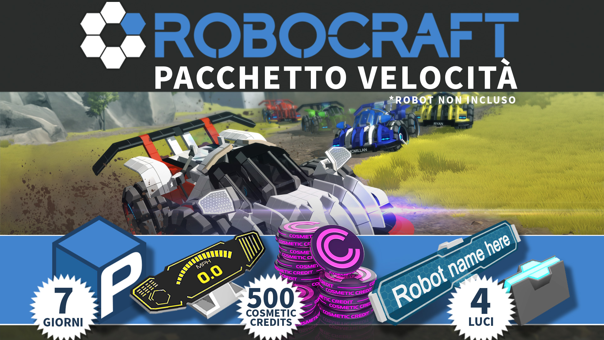 Con il pacchetto Velocità corri a costruire il robot dei tuoi sogni in Robocraft. Il pacchetto offre ai giocatori sette giorni di abbonamento Premium, oggetti multipli e 500 Crediti Cosmetici da usare per l’acquisto di oggetti cosmetici all’interno del gioco.