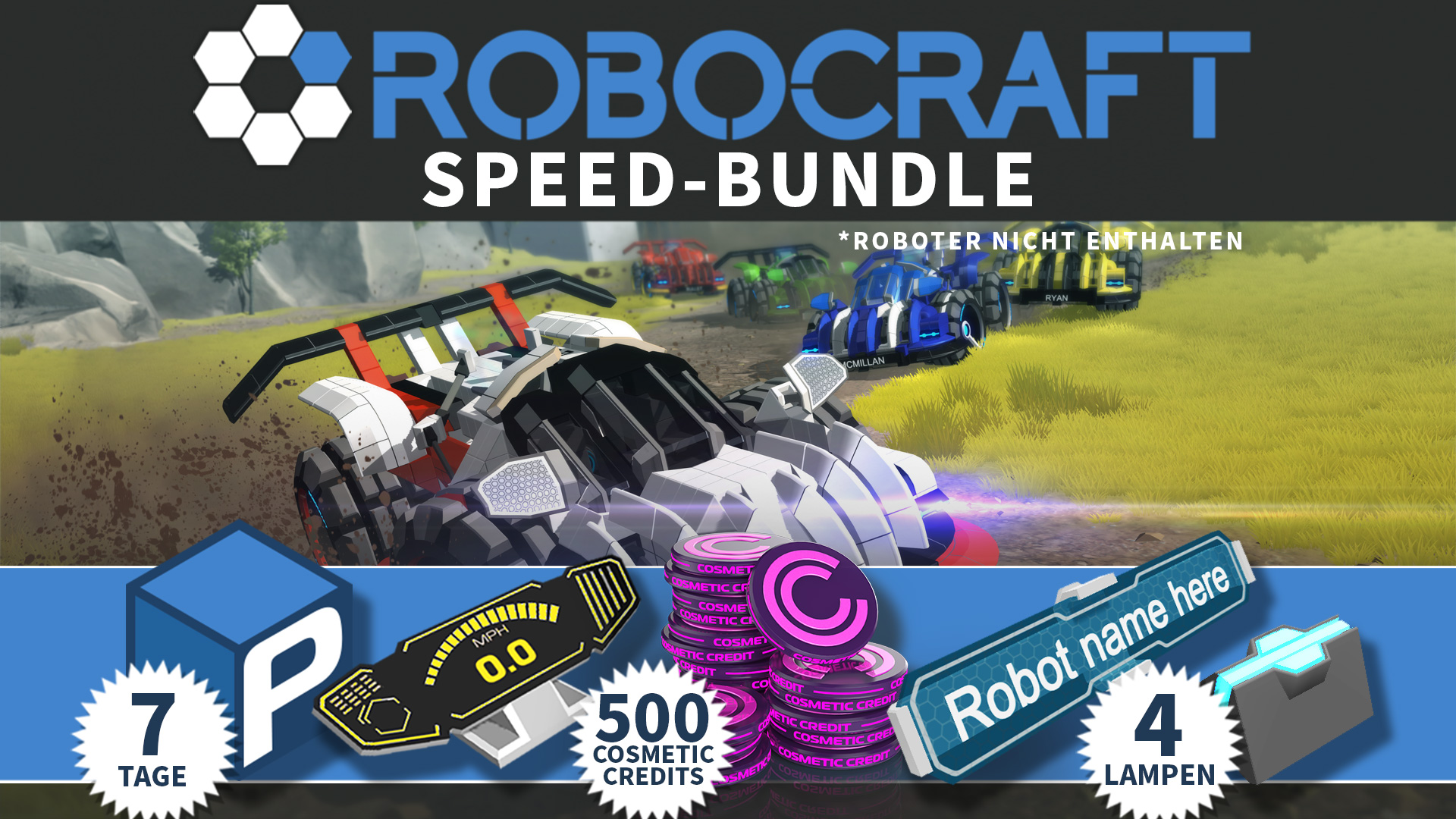 Das Speed-Bundle ist deine Überholspur für den Bau deines Traum-Roboters bei Robocraft. Das Bundle bietet Spielern sieben Tage Premium-Mitgliedschaft, mehrere Gegenstände und 500 Kosmetik-Credits können eingesetzt werden, um im Spiel kosmetische Gegenstände zu kaufen.