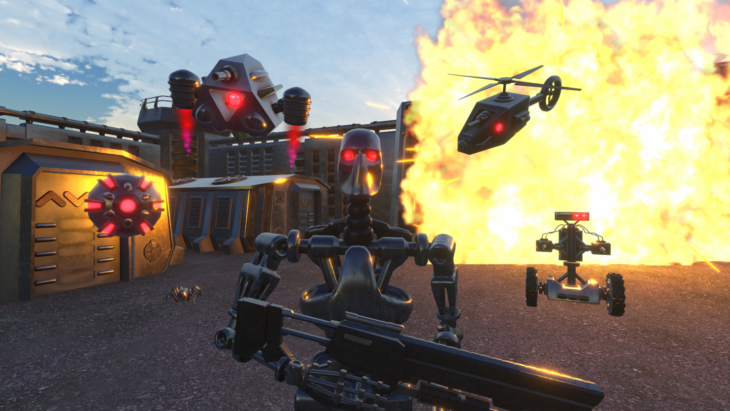 Robot Incursion is a virtual reality wave shooter for SteamVR. You can't get away with just standing still and you will need to physically move around, taking cover and dodging bullets. You will need a play space of at least 2 x 1.5 metres.