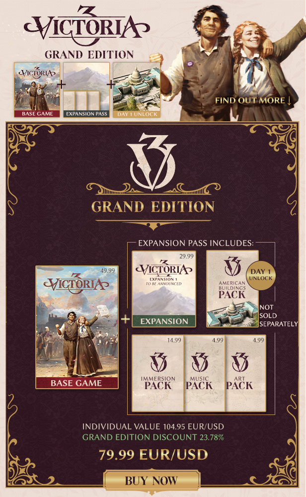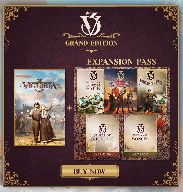Get the full experience of Victoria 3 with the Grand Edition, which includes the base game as well as the expansion pass, including: