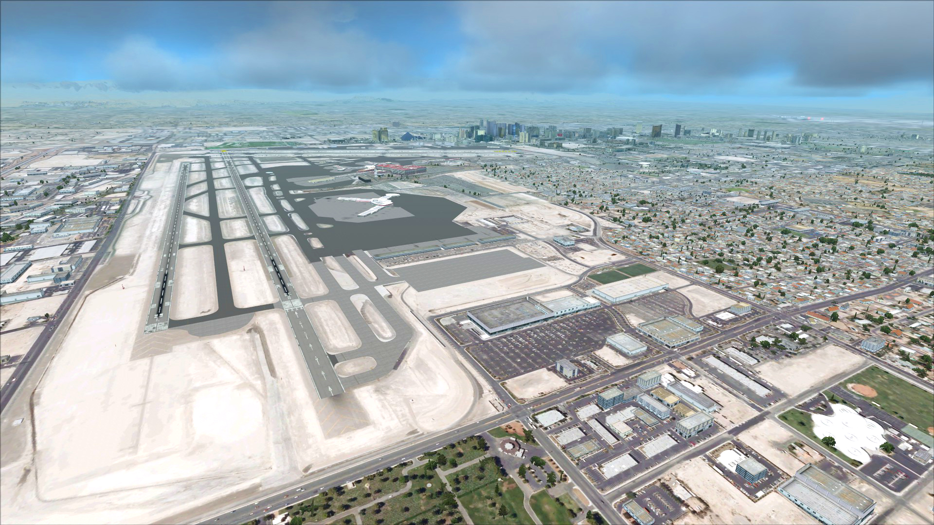 • Major airports in and around the city are covered with high res ground images with customized mesh terrain (no new building structures added) including McCarran Int’l, North Las Vegas, Henderson Executive, Yucca Airstrip, and more.