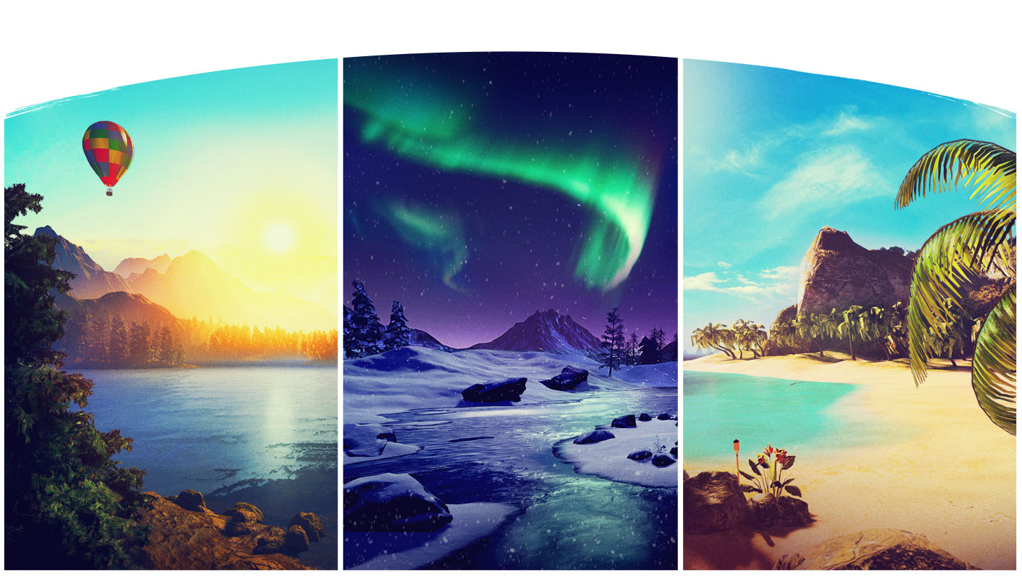 Discover three idyllic locations - Tropical Beach, Northern Lights and Mountain Wilderness. Choose different times of day and viewing points to find that perfect place for you.