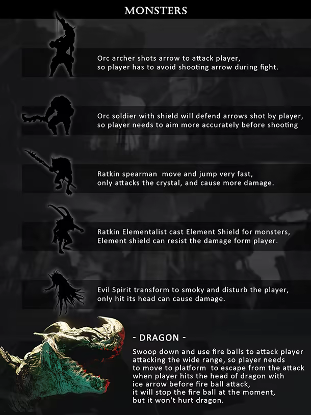 To protect crystal with super magic power, using the power of the bow and arrow and elements to fight Orc's attack!
