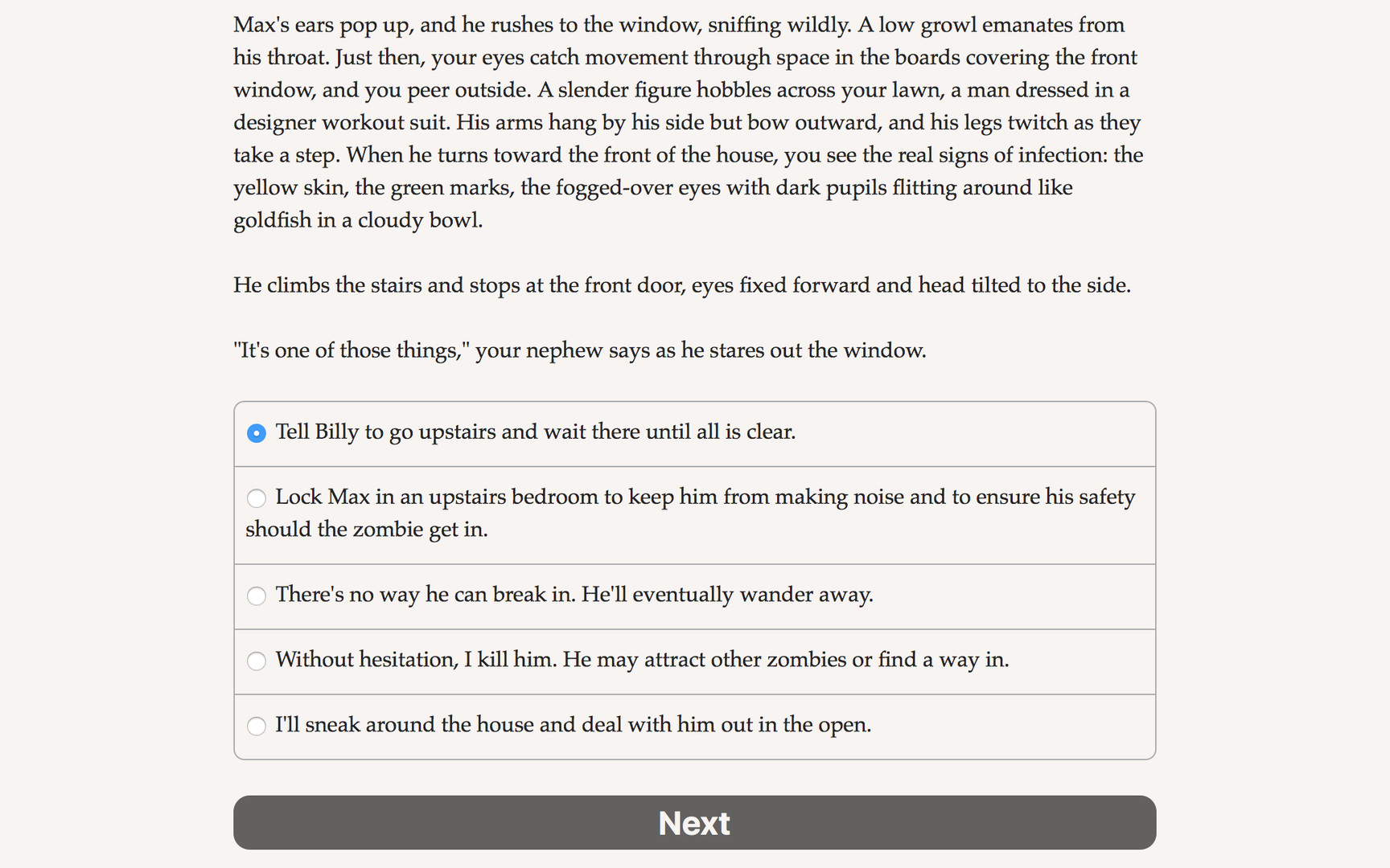 Zombie Exodus: Safe Haven is a series of thrilling interactive survival-horror novels by Jim Dattilo, where your choices control the story. It's entirely text-based—without animation or sound effects—and fueled by the vast, unstoppable power of your imagination.