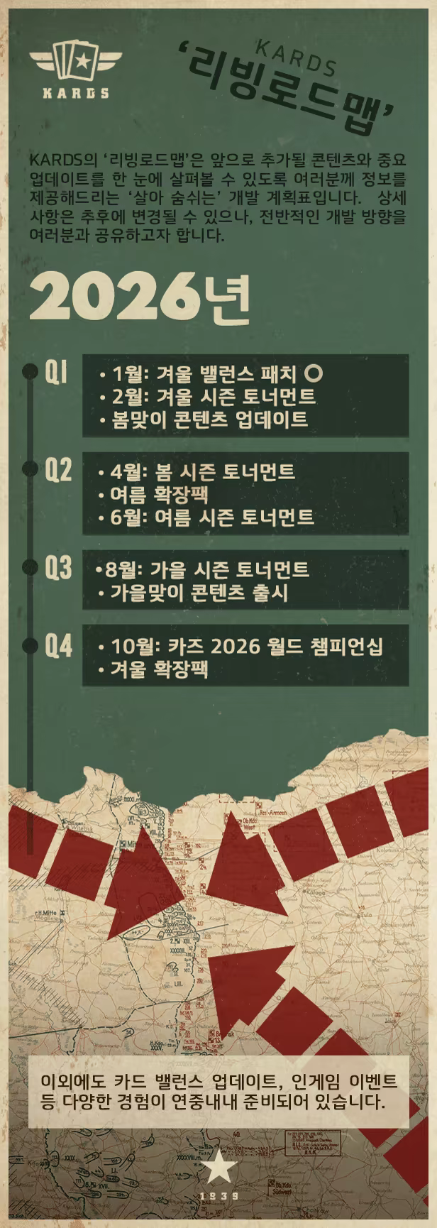 KARDS는 실제 전술 및 고전 전략 게임에서 영감을 얻은 독창적인 메커니즘과 정통 CCG(Collectible Card Game)를 접목시킨 제2차 세계 대전 카드 게임입니다. 지상과 공중, 바다에서 펼쳐지는 대규모 전투의 지휘를 맡아 다른 플레이어들과 겨뤄보십시오.