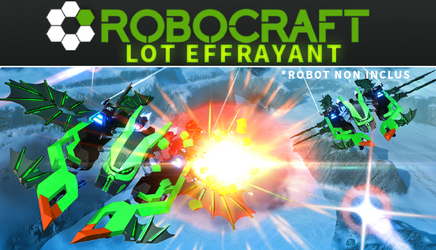 Veuillez noter que les robots présentés dans les plans promotionnels ci-dessus ne sont pas compris dans ce lot. Ce lot ne peut être acheté qu’une seule fois par compte Steam, et après l’achat, le contenu de ce paquet est livré à la première connexion de l’acheteur dans Robocraft."