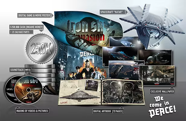 • The Digital Artbook - This packed artbook features 72 pages of art from Iron Sky the film and Iron Sky Invasion the game! Look at the pretty pictures!