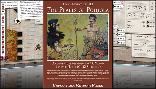 1 on 1 Adventures #13: The Pearls of Pohjola is designed for a Sorcerer level 10-12, but with some minor scaling, The Pearls of Pohjola is suitable for use with a traditional four-player party.