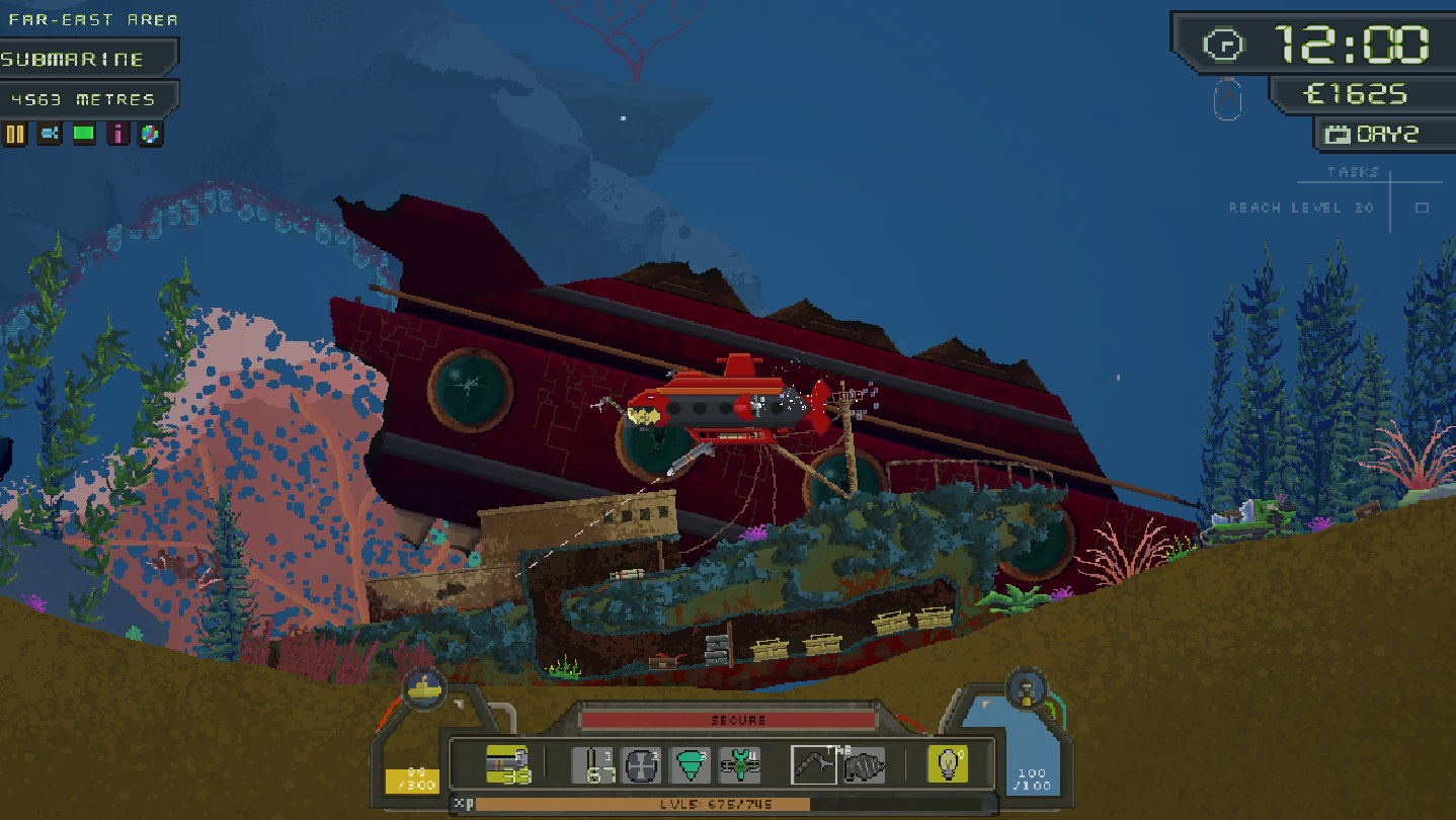 Utilise your equipment in a stylish blend of combat and beautiful aquatic moments, with a great original soundtrack and ambient sounds; we have created a living, breathing underwater world in pixel art graphics, with it's own day/night cycle. Much of the world is destructible, from blowing up wreckage doors with C4, to drilling and torpedoing your way through rock for fuel cells and chests.